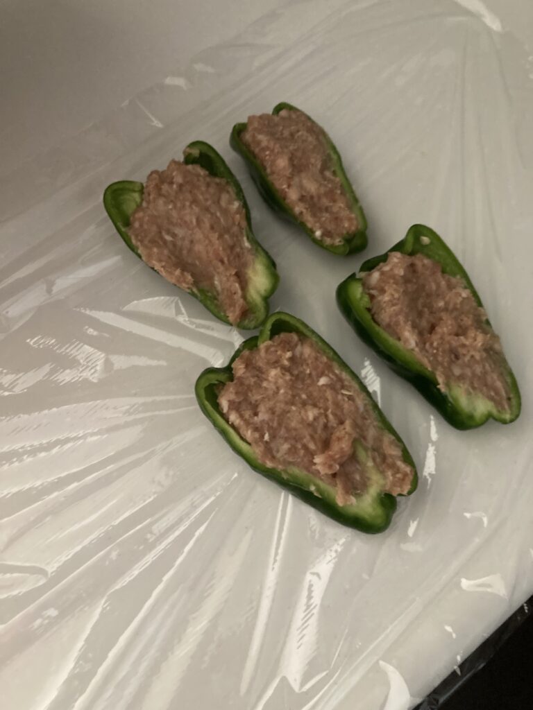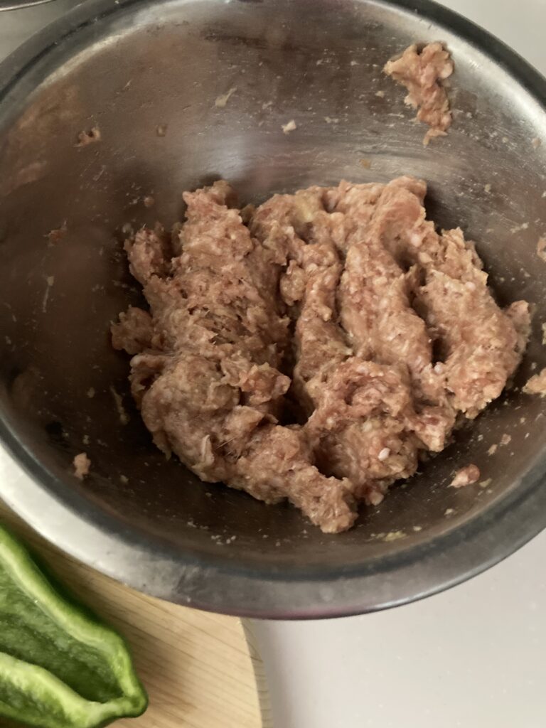 下準備が終われば、あとはピーマンにこねたお肉を詰めていくだけの簡単なお料理でした。