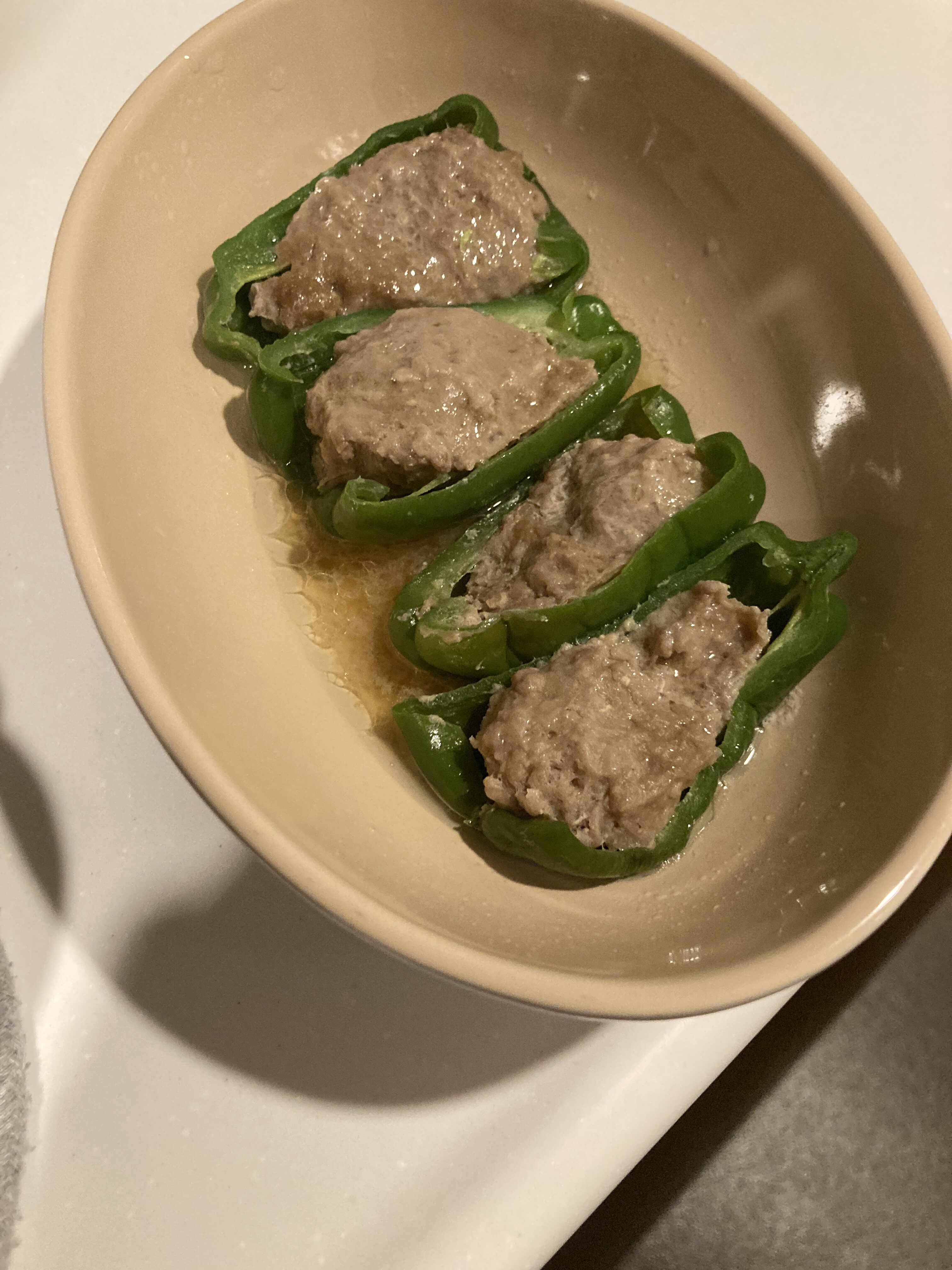 このピーマンの肉詰めはYouTuberのマツモトマイさんの1人前食堂から真似して作りました。