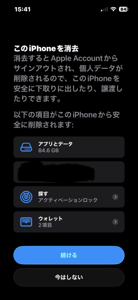 後は「続ける」をタップしたらデータが消え、電源が切れている状態になるのでこれで安心して出品できます。