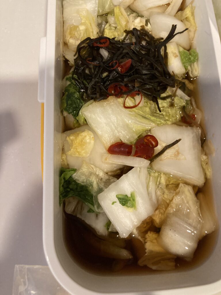 白菜を容器に入れて、ぐつぐつ煮だったつけ汁も入れて味を染み込ますのに30分置いたら完成。
